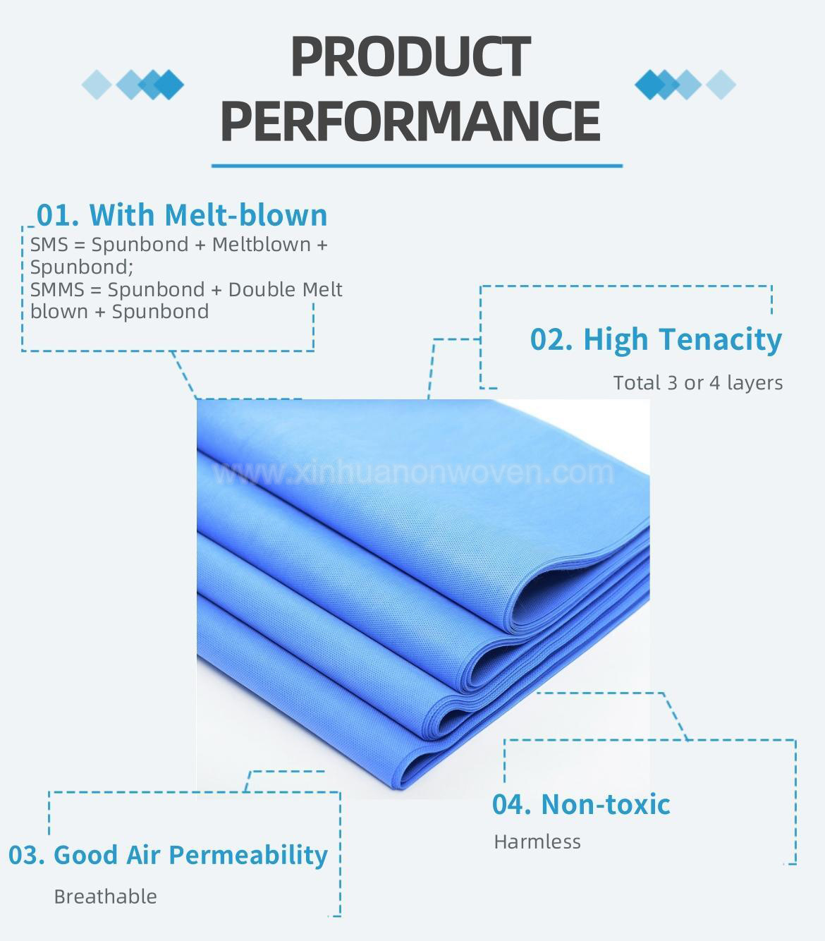 Kita kain non woven medis Menggunakan kain nonwoven SMS, kain nonwoven komposit tiga lapis yang terdiri dari satu lapis polipropilena meltblown dan dua lapis polipropilena spunbond. Kain ini memiliki sifat tahan air, bernapas, tahan lama, dan tahan sobek yang baik. Kain nonwoven SMS memiliki beragam kegunaan dan dapat dibuat menjadi gaun bedah, pakaian pelindung, brosur medis, sarung tangan, penutup sepatu, dan produk lainnya.